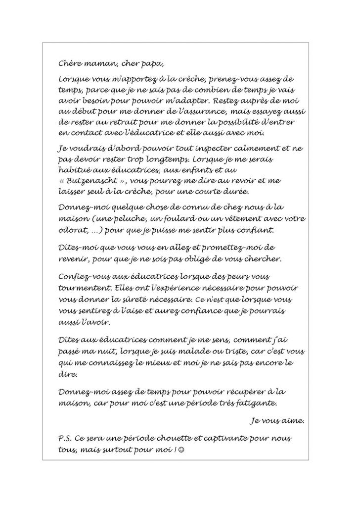 Avec la confirmation écrite, les parents reçoivent notre règlement d’ordre interne et une lettre décrivant l'adaptation du point de vue de l'enfant.