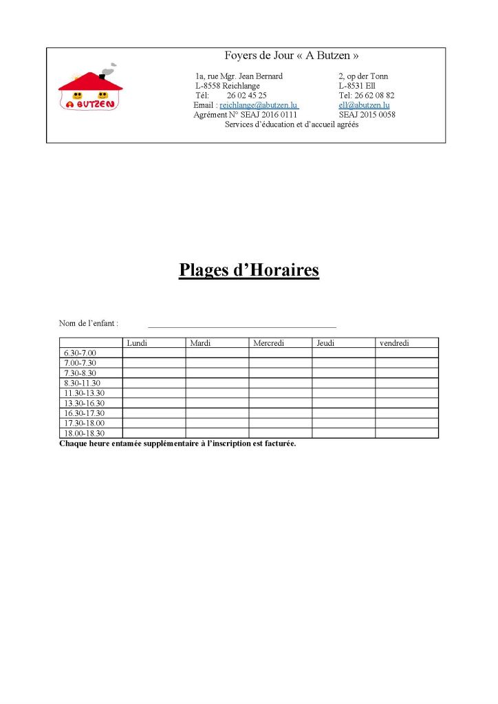 Bei der definitiver Aschreiwung gëtt e Kontrakt tëschent den Elteren an dem SEA ënnerschriwwen. D’Eltere kënnen hir Kanner tëschent 3 hallwen a 5 ganzen Deeg, zu festgeluechten Zäitfënsteren aschreiwen, et ass eis ganz wichteg mat all Famill optimal Betreiungszäiten auszeschaffen. D’Aschreiwungszäite sinn d’Basis fir d’Facturatioun. Kranken-Deeg a fräi Deeg ginn zu bestëmmte Konditiounen net fracturéiert, dat sinn
